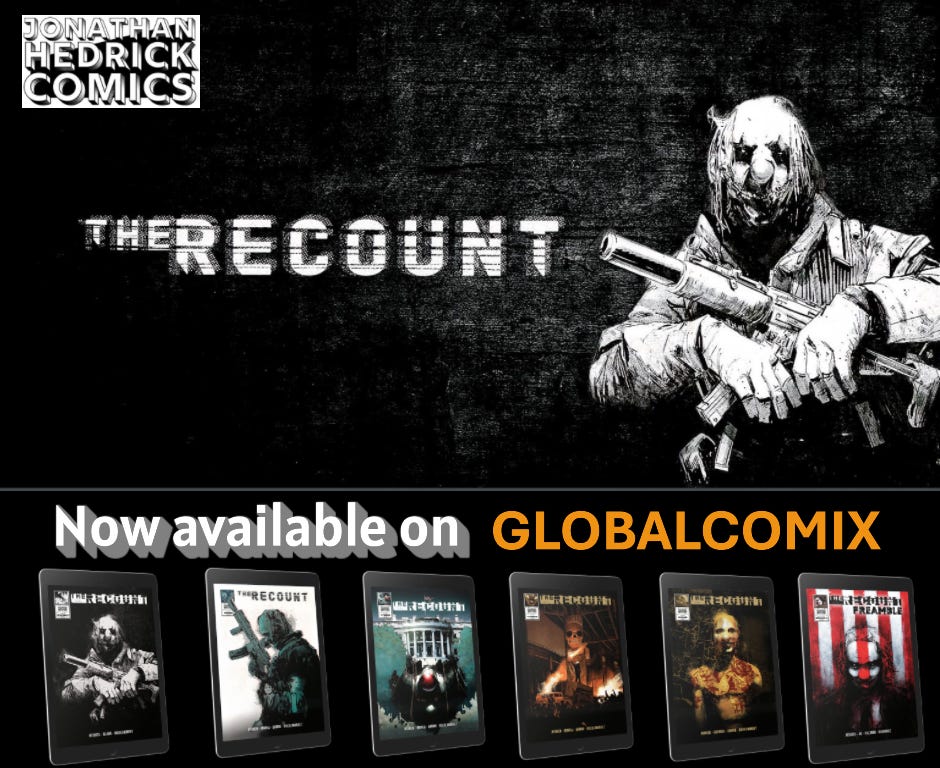 I regained the full rights to The Recount back from Scout Comics after the publishing contract expired. Then, I proceeded to give the series away right here on my Substack across 17 weeks…for free! Afterwards, I had the covers redressed and the credit pages redesigned by the Geek Collective before adding them to GlobalComix. The series already has over 1000 views there!