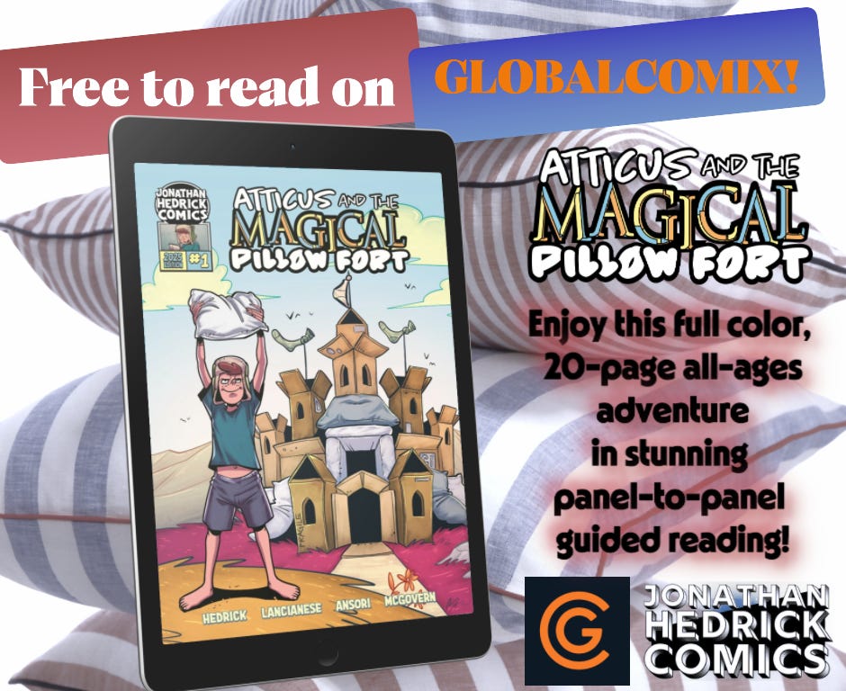 It took awhile but we finally got printed copies of Atticus & The Magical Pillow Fort #1 out in the world. The campaign was a humble one with 95 backers pledging a total of $1,887. But considering the climate of crowdfunding and it being an all-ages book, I was just happy we reached our modest goal of $500. If you missed out on backing it, you can still get copies from Famous Faces & Funnies or Crescent City Comics in New Orleans, LA. It’s also available on GlobalComix. It’s close to having 1000 views!
